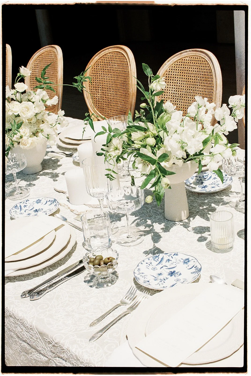 “The reception featured layered tablescapes with editorial-worthy linens, artistic stationery printed on refined materials, and abundant florals designed to echo the estate’s architecture. The tabletop featured premium china and crystal glassware, including a personal olive dish for each guest. A four-tier vintage cake paired with a styled lace linen and wood table also added to the intimate yet grand feel.” Bryce Gaston, Designer. 35 mm film.