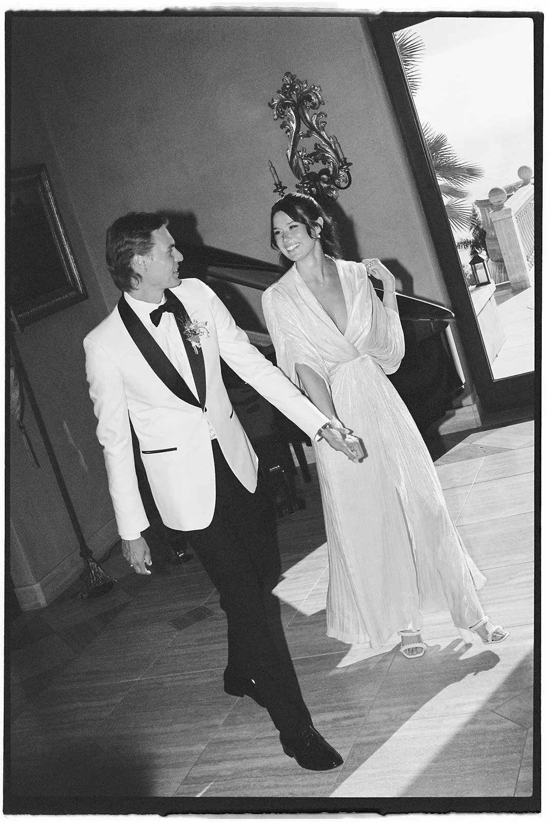 The bride and groom preparing to make their grand entrance. 35 mm film.