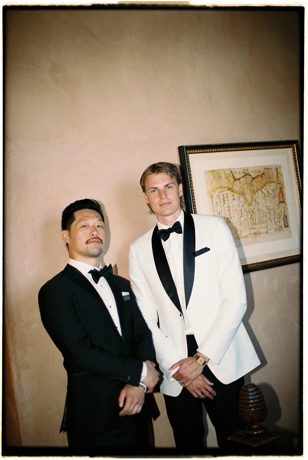 The groom and the best man in their custom Zeglio tuxedos. 35 mm film.